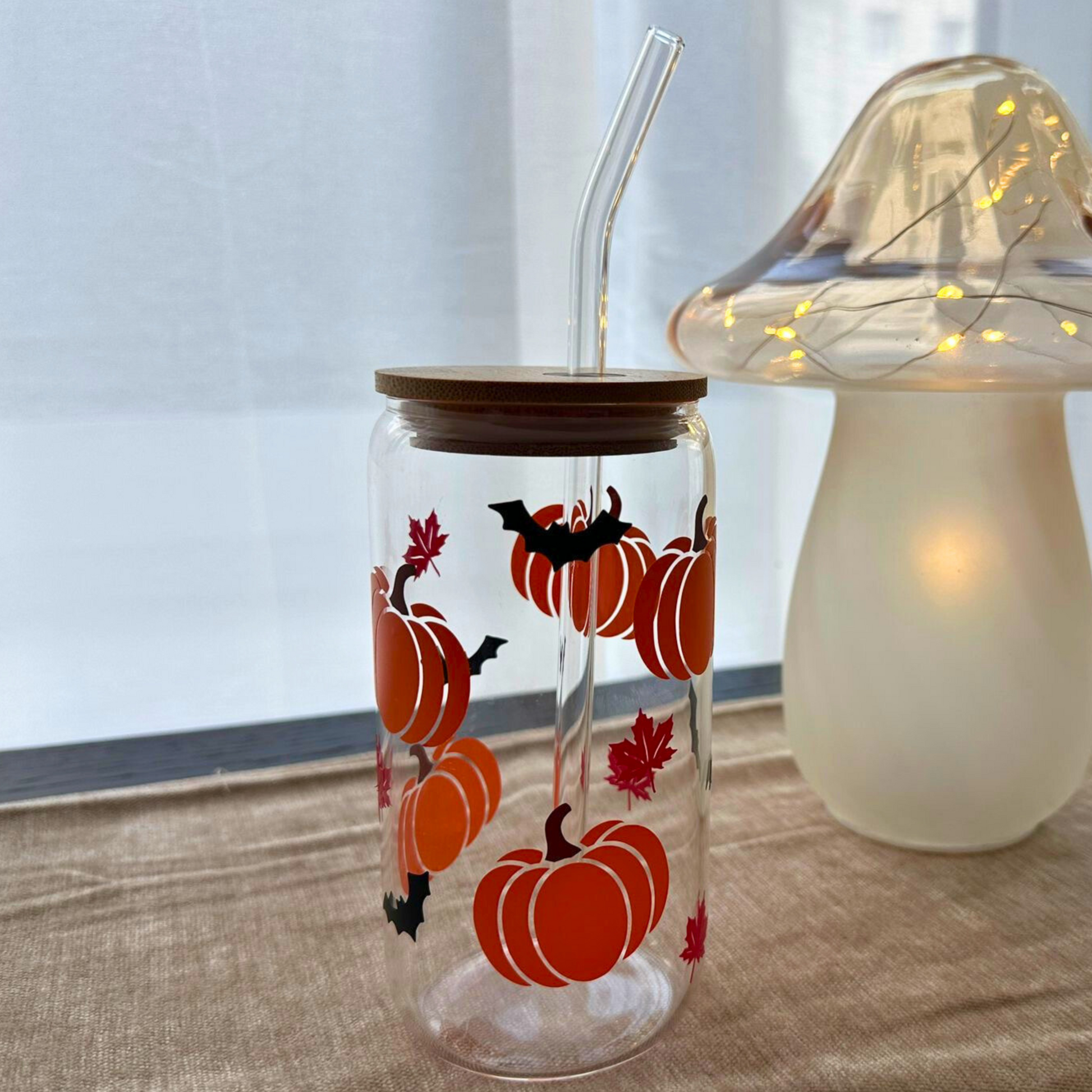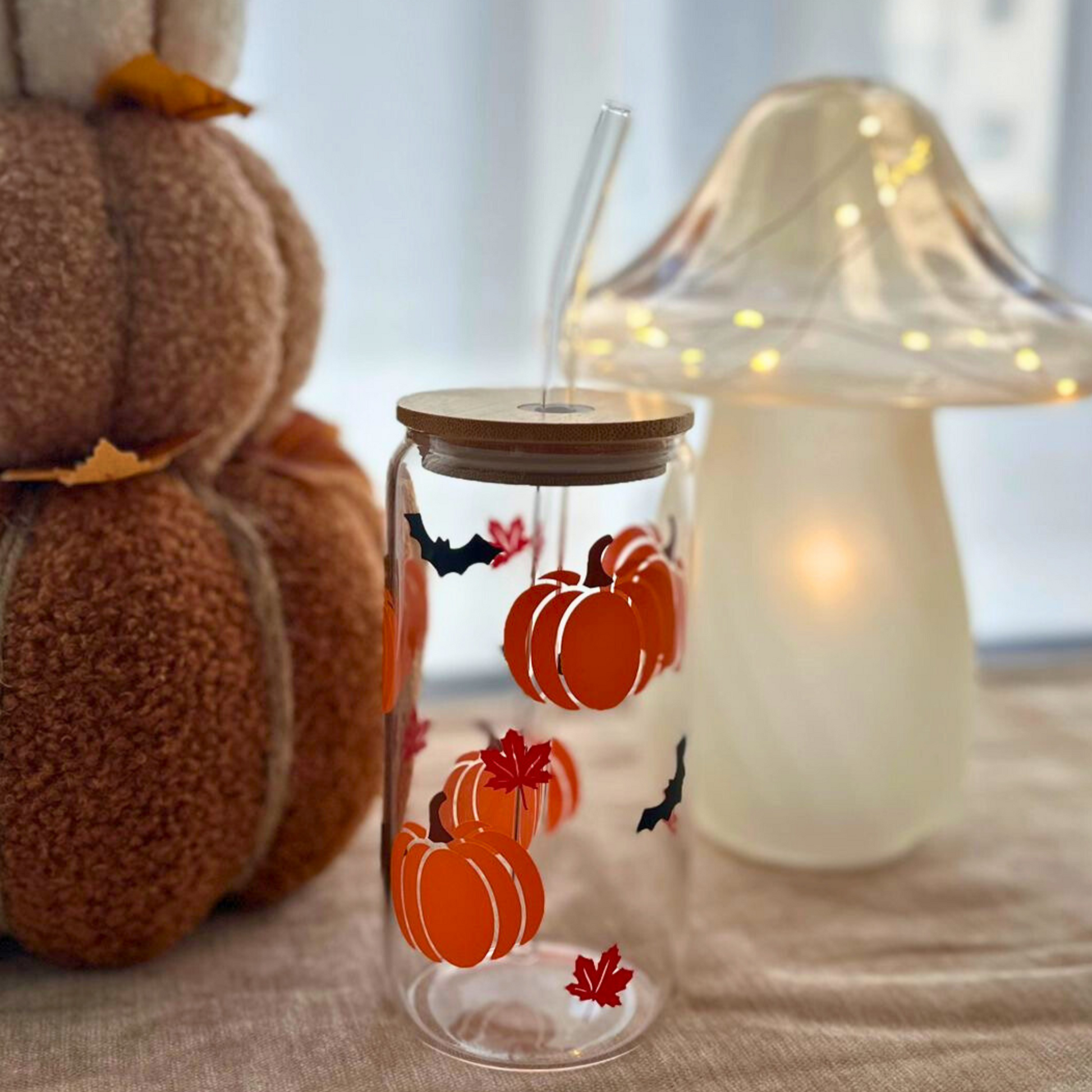 SPECIAL EDITION - Dieses Trinkglas bringt dir den perfekten Herbstmoment direkt nach Hause! Mit süßen Kürbissen, kleinen Fledermäusen und Ahornblättern verziert, ist es der ideale Begleiter für Pumpkin Spice Latte, Eiskaffee oder deinen liebsten Herbst-Tee.